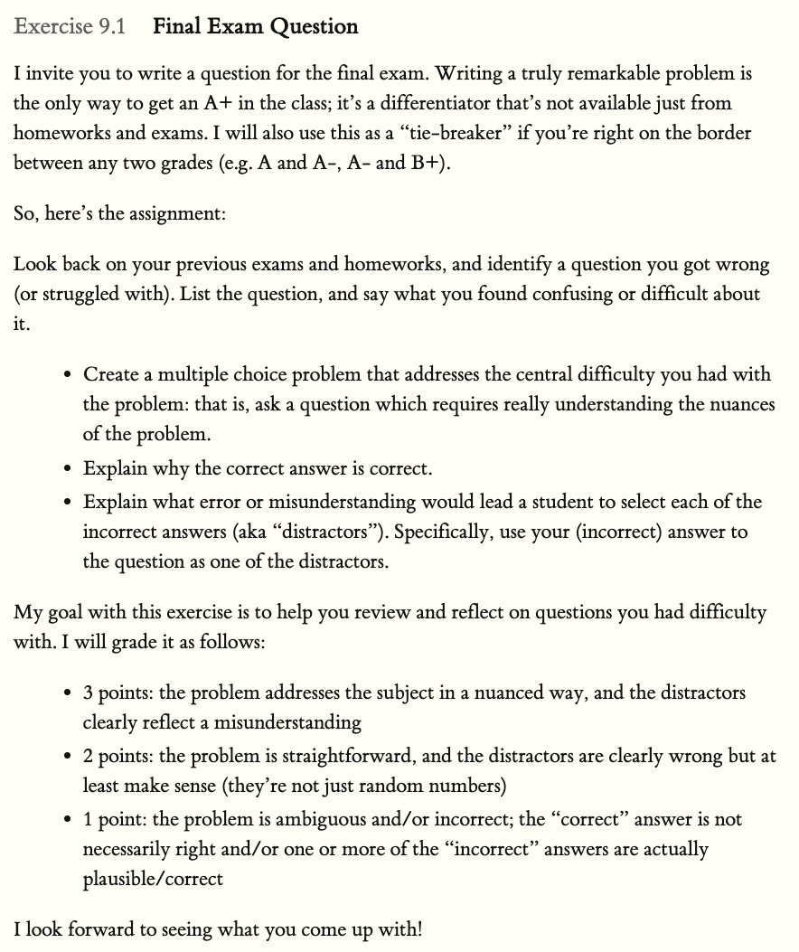 There is no cutoff for an A+, but I will give out a limited number of A+'s. The way to earn an A+ is to submit a question for Exercise 9.1 on the homework. A+ grades will be given to people who are both at the top end of the grade distribution and demonstrate the nuance of their knowledge through writing an incisive exam problem.