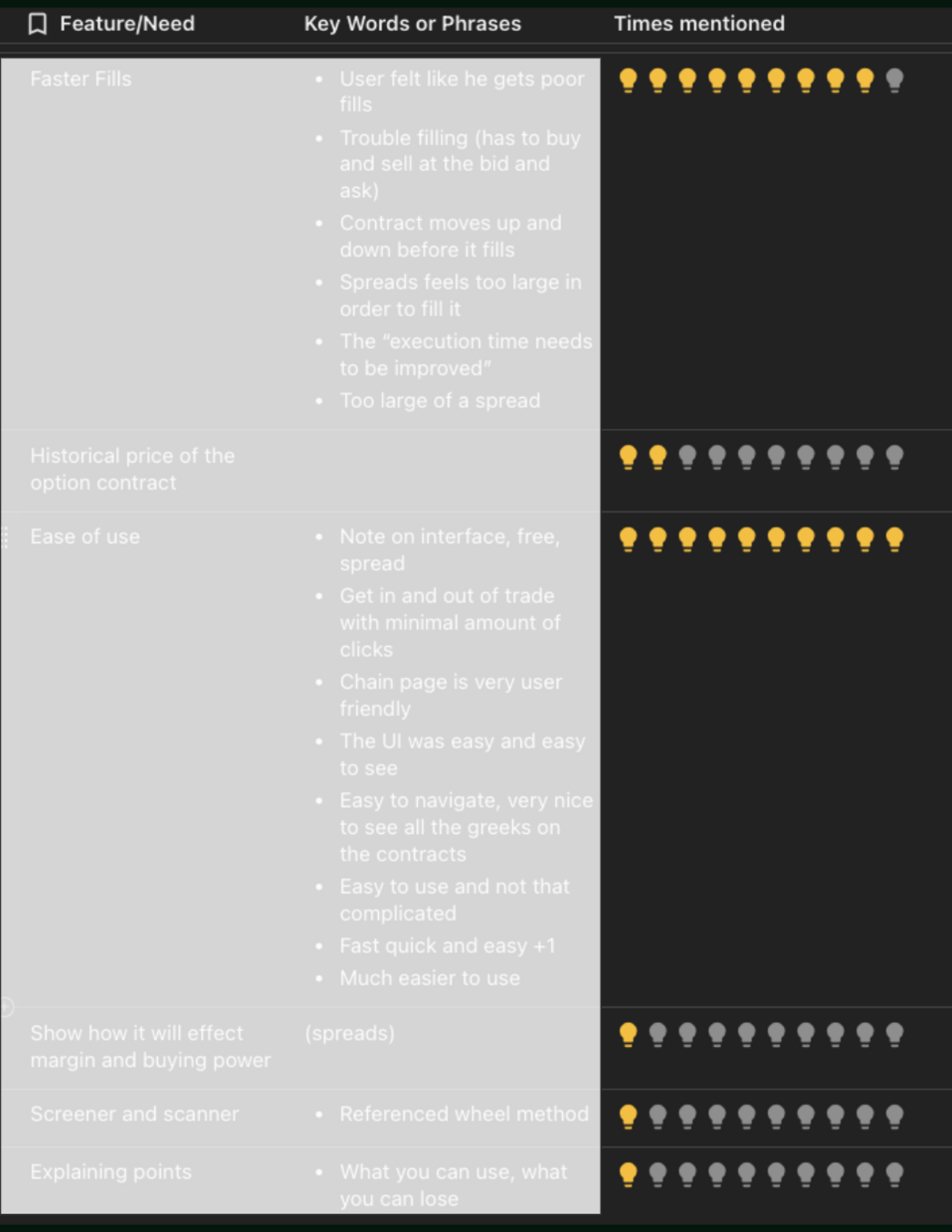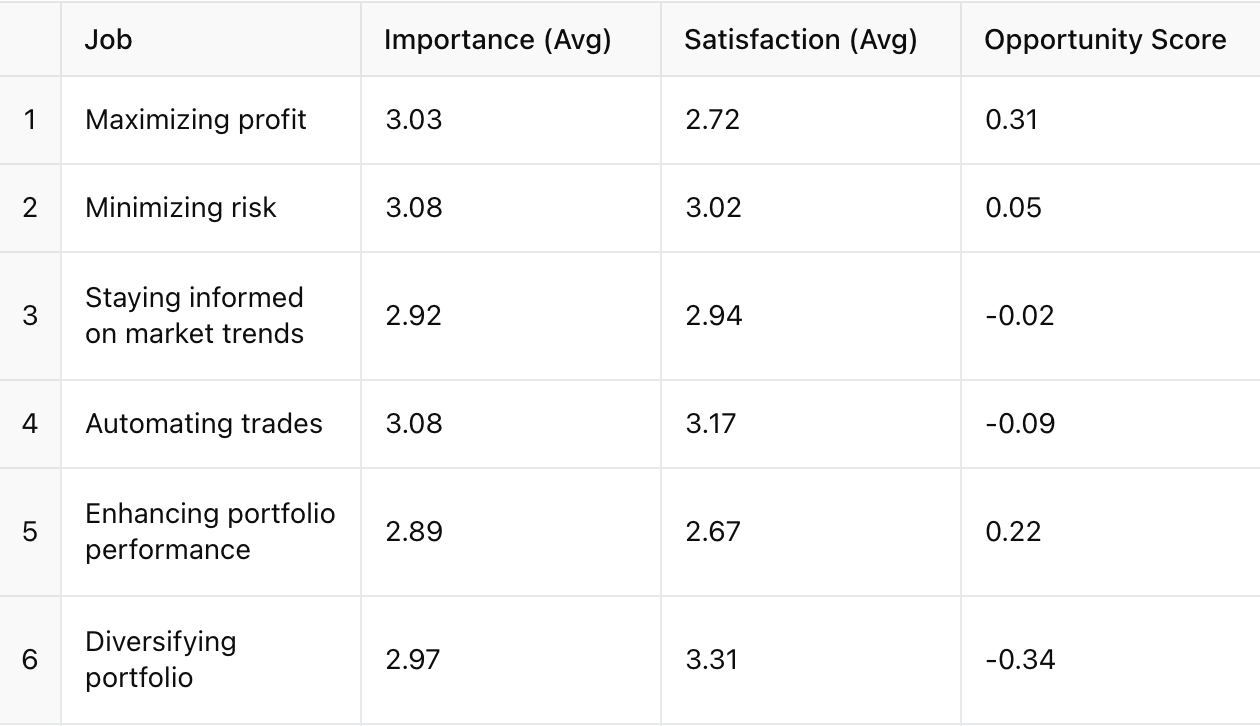 The primary component was a max/diff assessment of the 15 most important product features for advanced trading. Lists were sourced from internal experts and chatGPT.