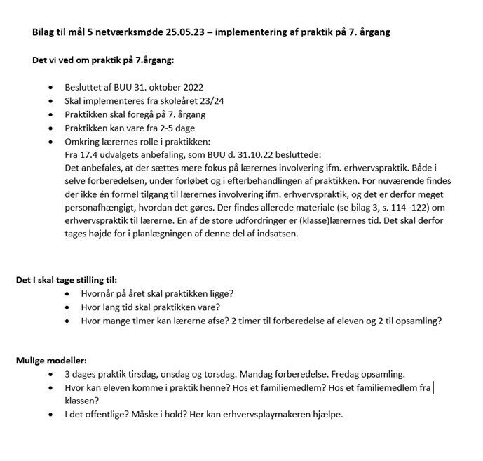 BUU krav til skolerne fra skoleår 23/24. 2-5 dages praktikuge. Forslag placering i ugerne 18-23 (Maj - midt juni)