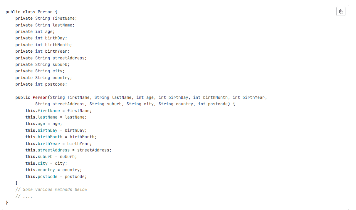 - Solution: Builder pattern, introduce parameter object, method calls inside construction