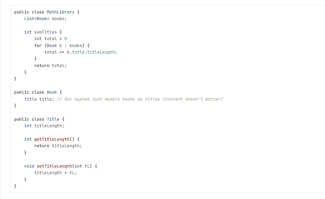 - Feature envy: one class is more interested in the details of another class than its own (potential Law of Demeter violations)