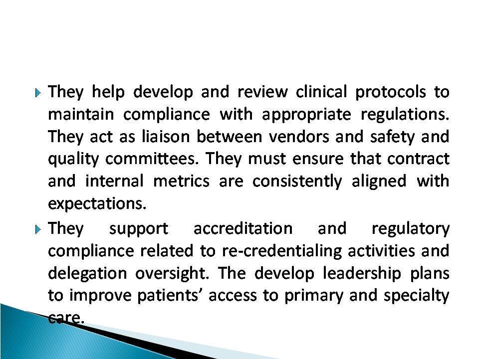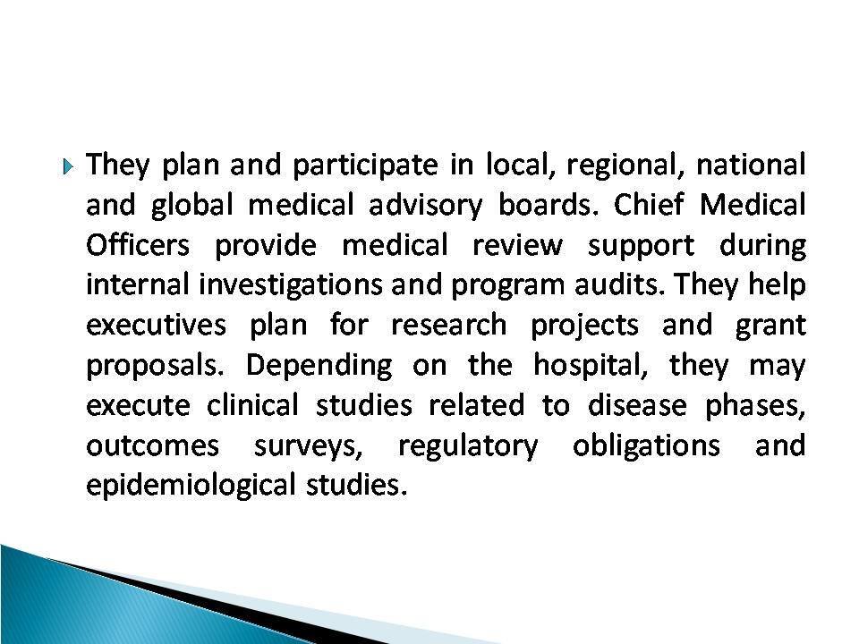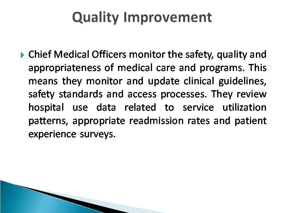 The functions of a Chief Medical Officer tend to remain the same from health care organization to organization because these professionals perform key duties and oversee key programs.