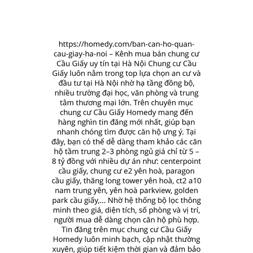 Website: https://homedy.com/ban-can-ho-quan-cau-giay-ha-noi. https://homedy.com/ban-can-ho-quan-cau-giay-ha-noi – Kênh mua bán chung cư Cầu Giấy uy tín tại Hà Nội Chung cư Cầu Giấy luôn nằm trong top lựa chọn an cư và đầu tư tại Hà Nội nhờ hạ tầng đồ
