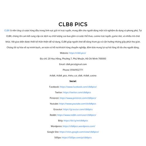 CLB8 là nền tảng cá cược hàng đầu trong lĩnh vực giải trí trực tuyến, mang đến cho người dùng một trải nghiệm đa dạng và phong phú. Website: https://clb8.pics/