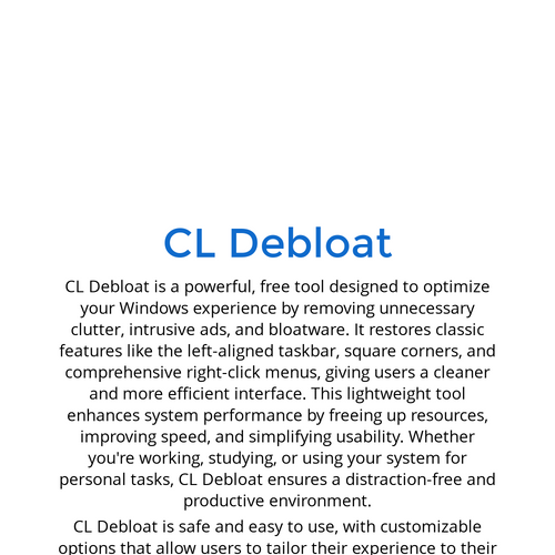 https://cldebloat.com/ CL Debloat is a free, safe tool that removes Windows bloatware, blocks intrusive ads, restores classic features, and boosts speed. It creates a distraction-free, efficient, and customizable user experience.
