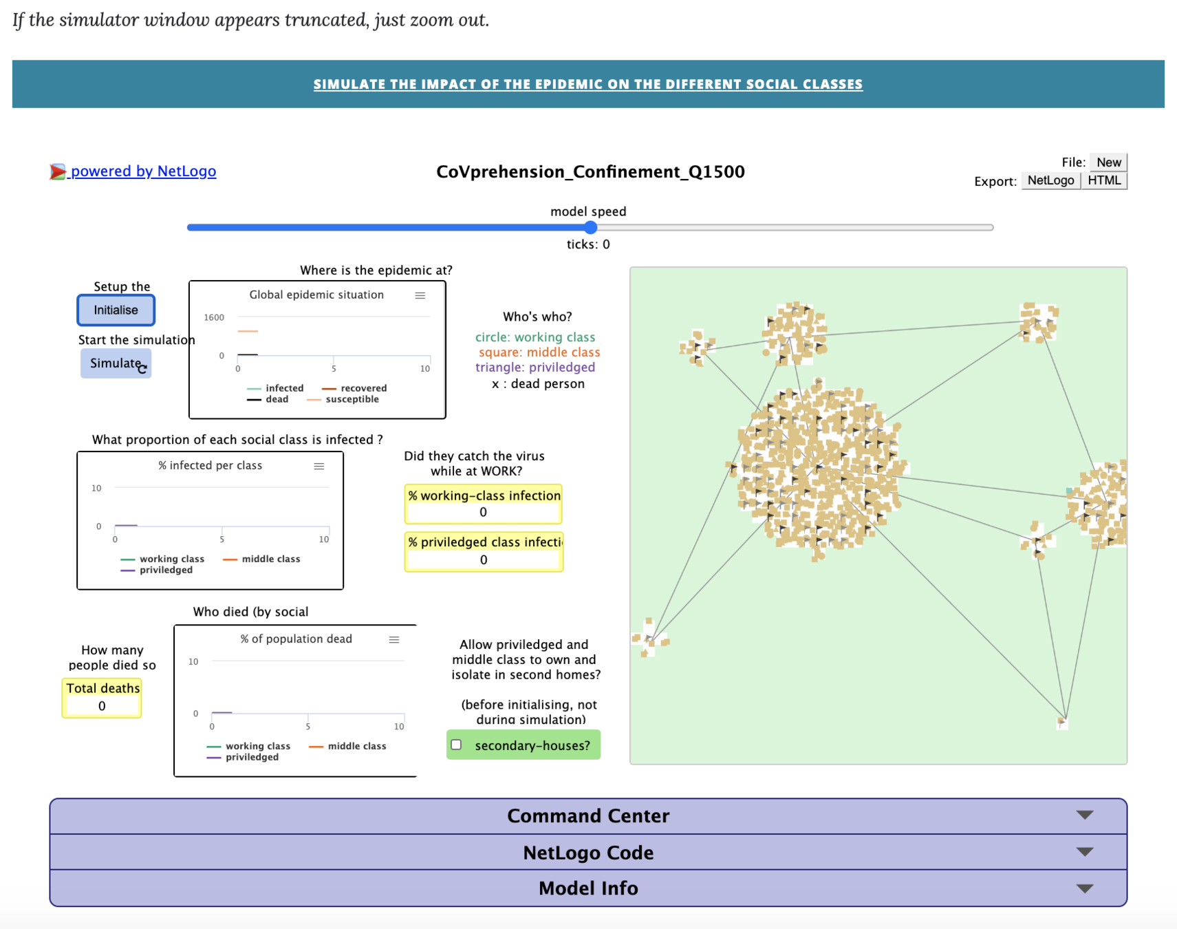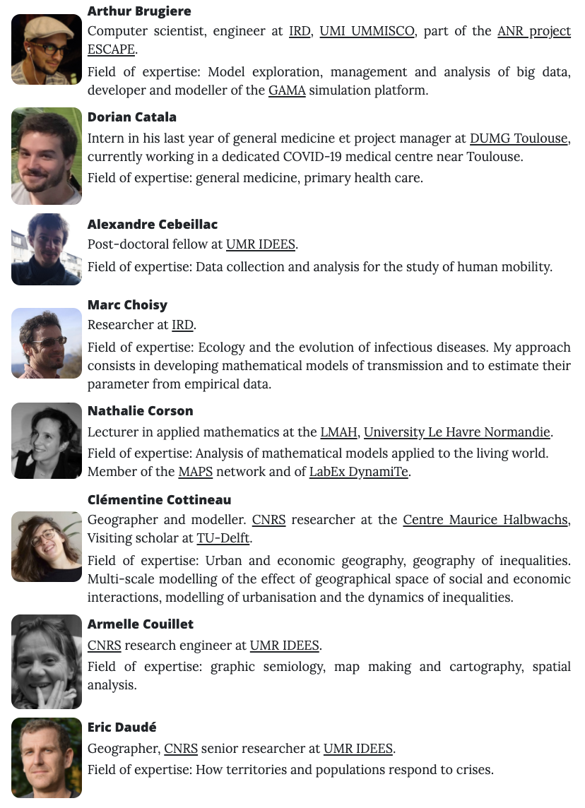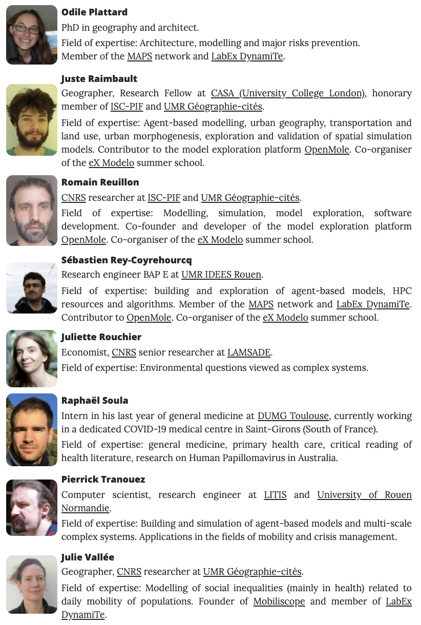 - CoVprehension collective, 2020, "Understanding the current COVID-19 epidemic: one question, one model", Review of Artificial Societies and Social Simulation, COVID-19 thread, http://rofasss.org/2020/04/30/covprehension/