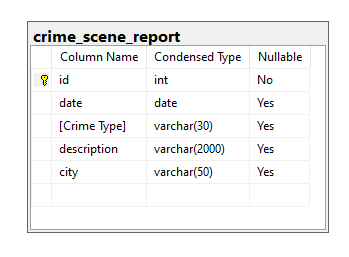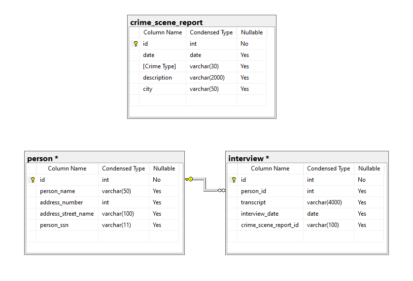NOTE: Thanks to the intern, some of the case data isn't organized like it should be, and we aren't able to rely on proper linking of two of the tables: interview should link to crime_scene_report, but it doesn't, making it more difficult to find the appropriate witness interviews for a crime scene report. Fortunately, DCPD detectives are pretty efficient and are able to interview all witnesses within 3 days of a crime. And the people of Cloud City are pretty honest people, even the criminals. They aren't going to lie to the police, so it's safe to assume their statements are factual.