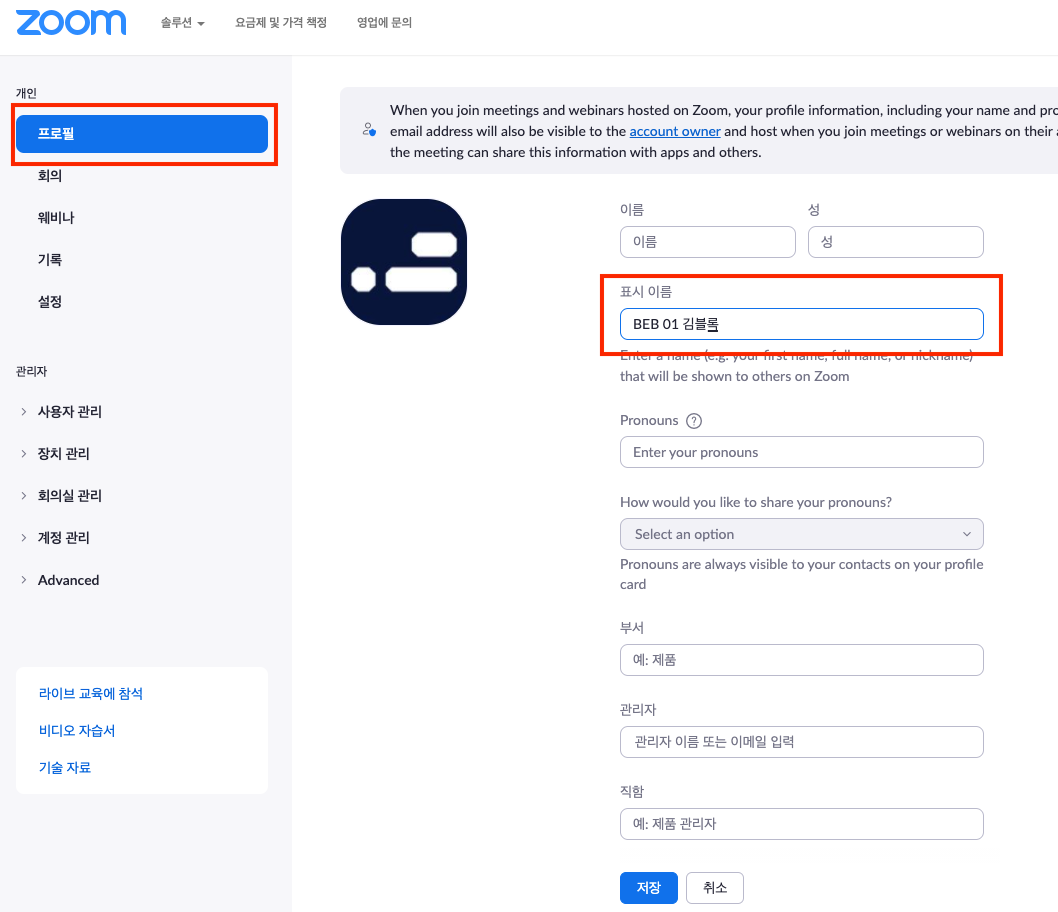 zoom 공식사이트 > 로그인 > 프로필 > 표시 이름(Display Name) 변경