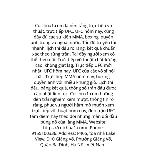 Website: https://coichua1.com/. Coichua1.com là nền tảng trực tiếp võ thuật, trực tiếp UFC, UFC hôm nay, cùng đầy đủ các sự kiện MMA, boxing, quyền anh trong và ngoài nước. Tốc độ truyền tải nhanh, lịch thi đấu rõ ràng, kết quả chuẩn xác theo từng tr