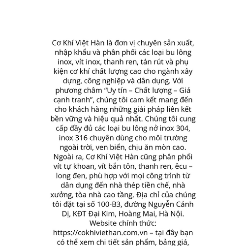 Website: https://cokhiviethan.com.vn/ Cơ Khí Việt Hàn là đơn vị chuyên sản xuất, nhập khẩu và phân phối các loại bu lông inox, vít inox, thanh ren, tán rút và phụ kiện cơ khí chất lượng cao cho ngành xây dựng, công nghiệp và dân dụng. Với phương châm