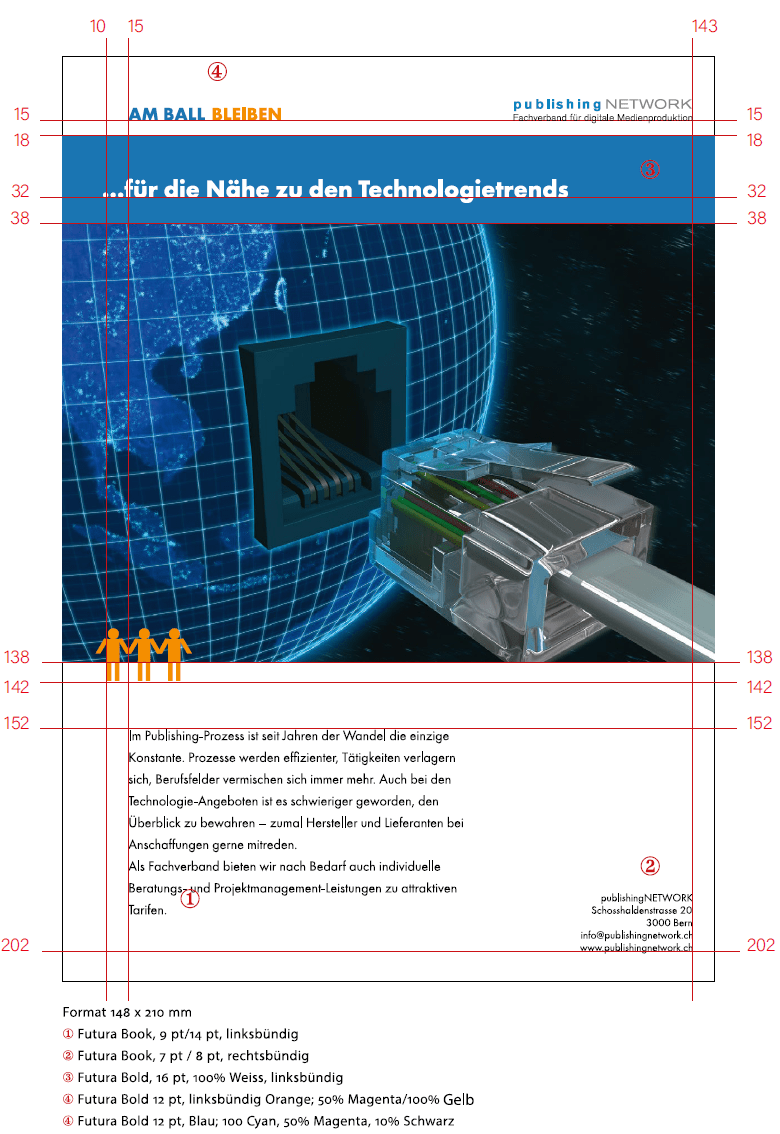 Erstellt ein- und mehrseitige Layouts mit Text, Grafik und Bild produktionsorientiert und mediengerecht.