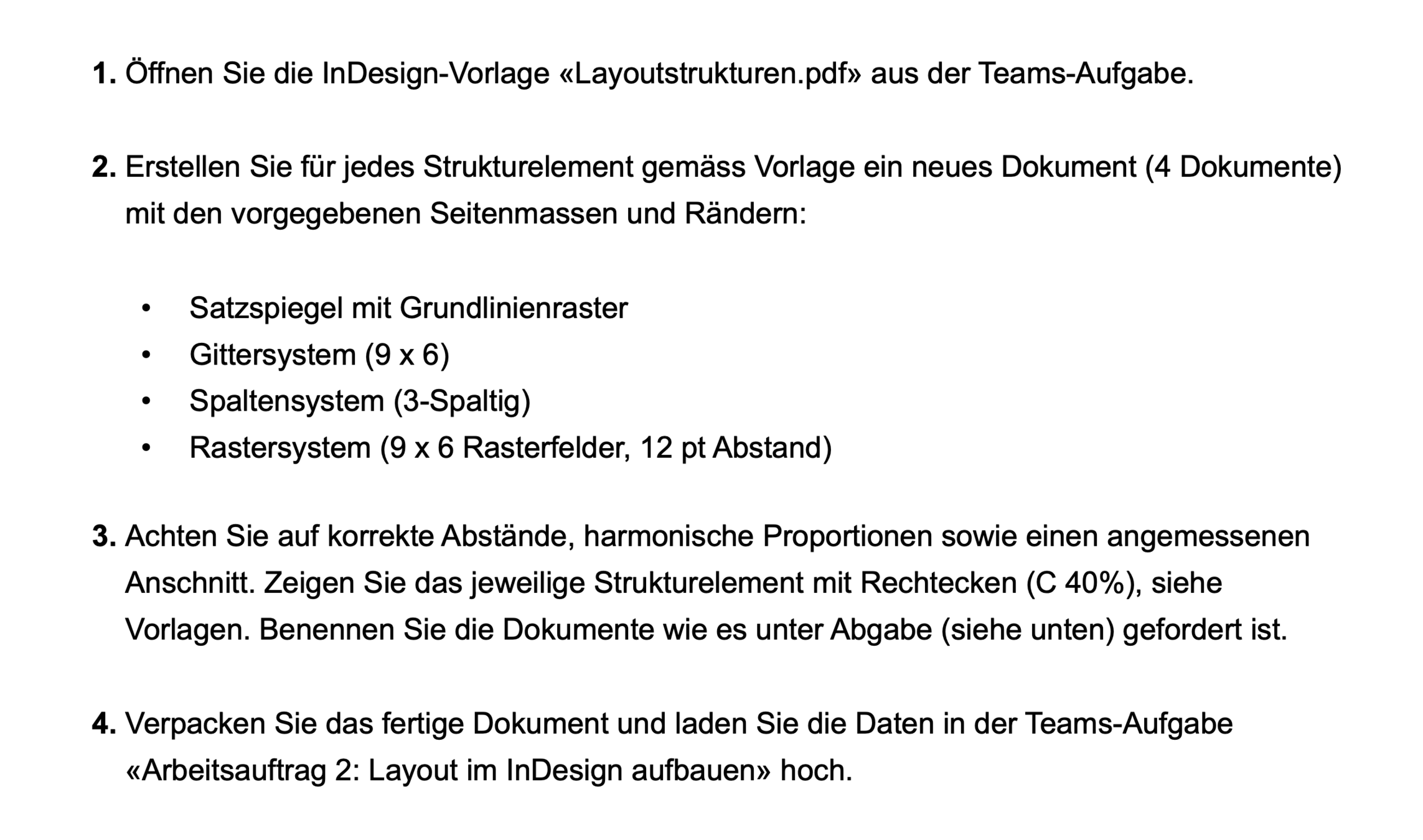 Die Lernenden können im Layoutprogramm anhand einer Beispielseite verschiedene Layoutstrukturen (Liniensystem, einspaltiges Layout, Spaltensystem, Rastersystem) einrichten und anpassen, sodass die Anordnung der Seitenelemente funktional, konsistent und typografisch korrekt ist.