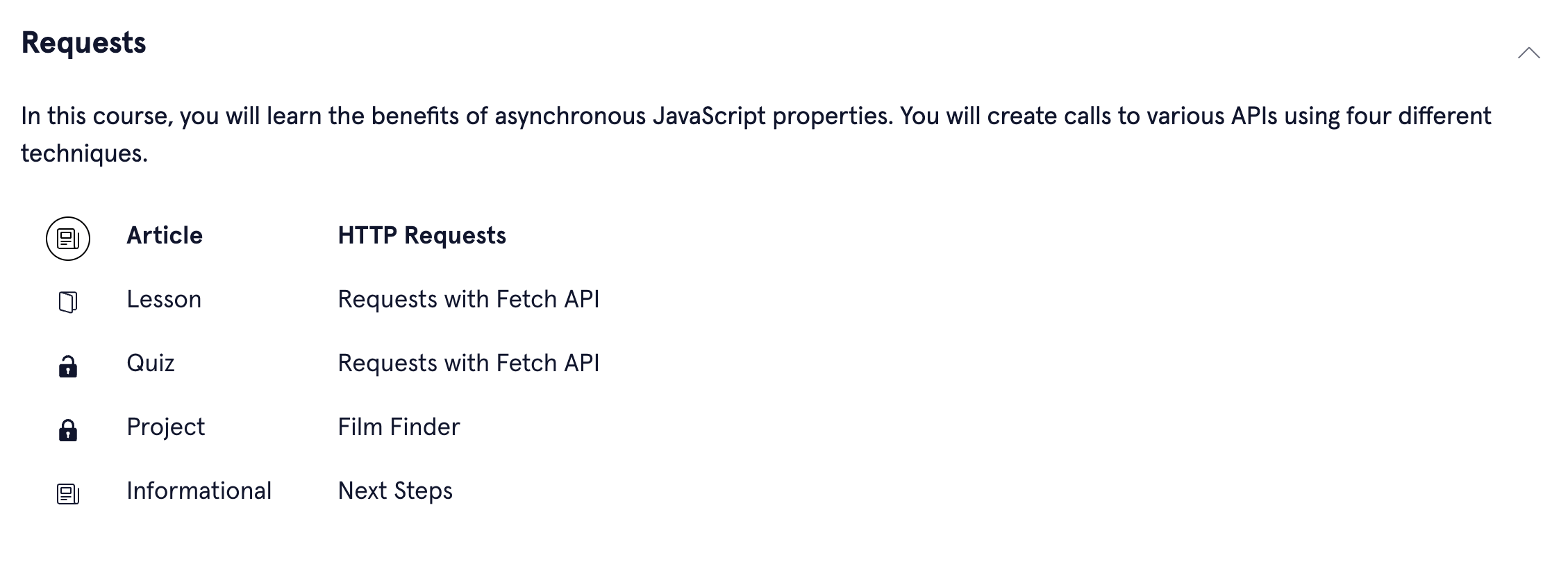 Wenn Sie mit dem JS Kurs auf Codecademy fertig sind, beginnen Sie mit «Learn JavaScript: Requests»: