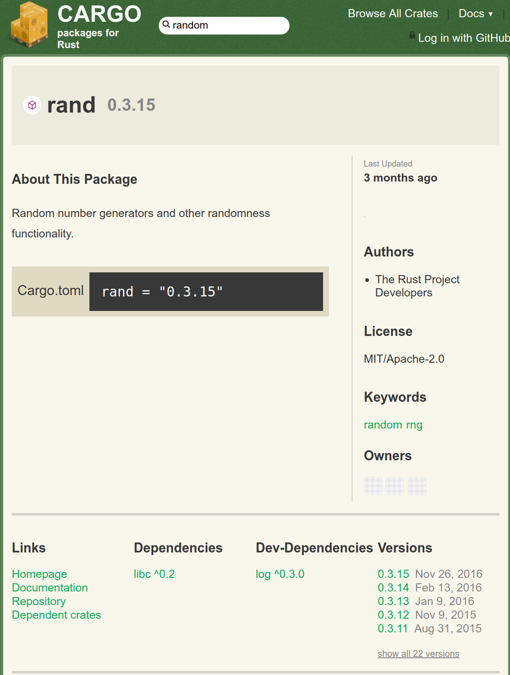 rand = "0.3.*" # Update to the latest patch versionCargo.toml