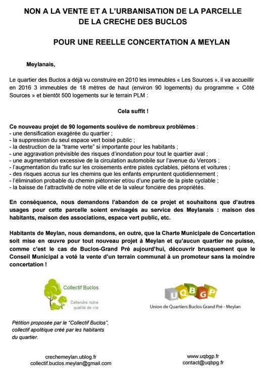 Le Collectif Buclos est un collectif apolitique. Il regroupe et mobilise les habitants du quartier Buclos - Grand Pré pour préserver la qualité de vie dans ce quartier. Quel avenir pour la parcelle la crèche des Buclos à Meylan ?