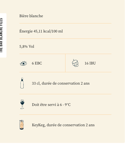 Bar Blanche est une bombe gustative. Avec son goût plein de malt, elle convaincra tous les amateurs de bières de blé. La couleur nuaguese et la tête crémeuse complètent le tableau.