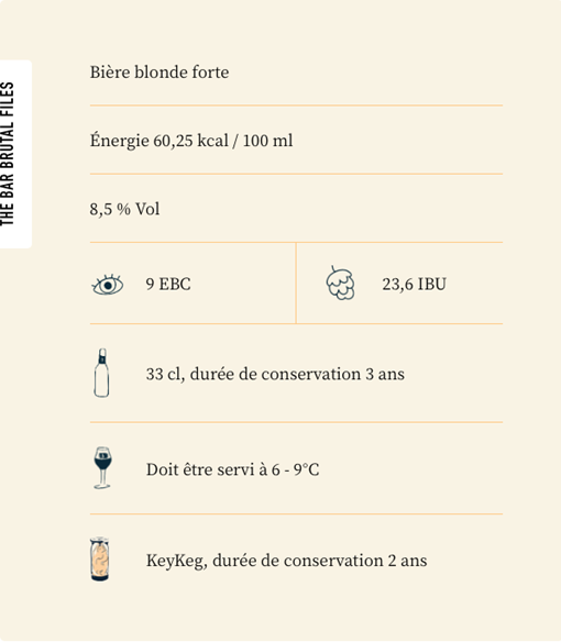 La blonde titre 8,5% d'alcool, ce qui en fait la bière la plus lourde que nous ayons brassée jusqu'à présent. Qui n'aime pas une jolie blonde avec du caractère? Mais attention, car avant que vous ne le sachiez, vous la verrez sous son aspect le plus audacieux.