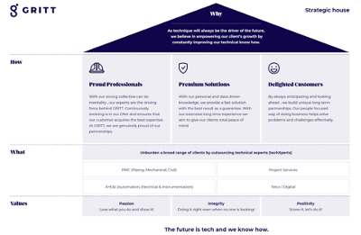 GRITT is a group of hard-working and passionate technical experts that offer the talent and resources needed to tackle any technical challenge. Gritt outsources specialized technicians, engineering consultants and turnkey infrastructure projects. Gritt holds 3 other known brands: TEC, Logi-technic and ETA.