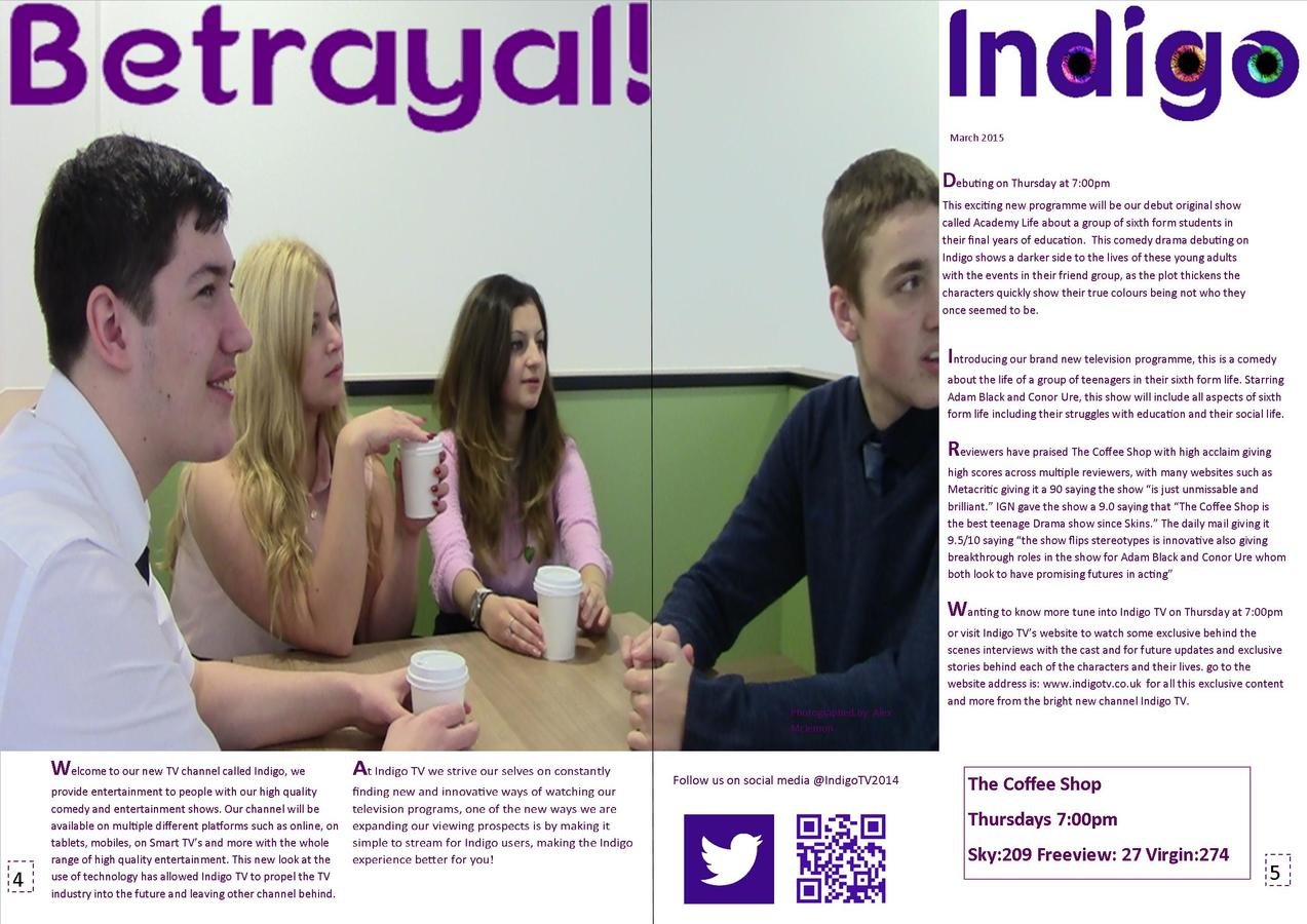 We stuck to many conventions when it came to creating our logo such as keeping the font colour consistent with our channels house style. The predominant colour we chose for our house style was indigo hence the name of the channel as we thought this summarized our channels ethos in that we are an alternative channel providing new and innovative programming. Most logos have more to them though than just the title of the channel therefore we wanted to add something that would make it stand out. We chose to include eyeballs as this symbolized that eyes would be on our product and this was a typical convention of a logo to include a special featured to it that helped it to stand out. We also used this same logo on all of the products we created as this kept a level of consistency throughout and made our logo identifiable.