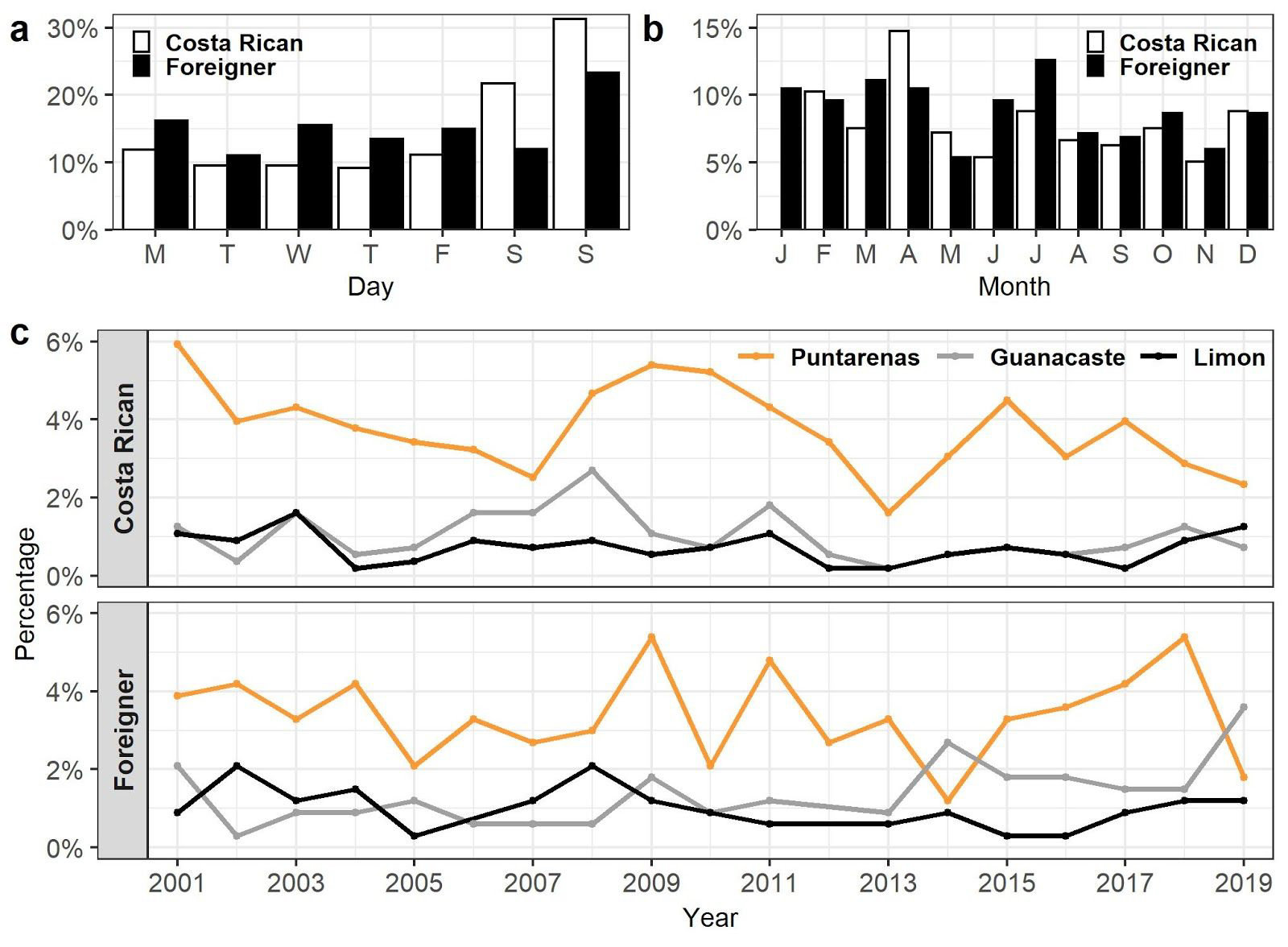 Figura 3: a) Percent of drowns per day and b) percent of drownings per month. c) The total number of Costa Rican drownings was 556 and the total number of foreigner drownings was 334 (Segura et al., 2020).