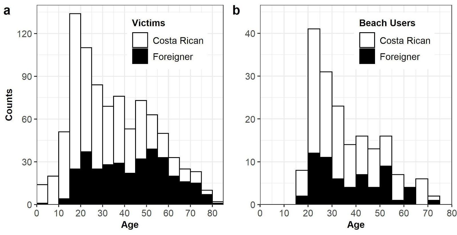 Figure 5. Age distribution of drowning victims for Costa Ricans and foreigners from 2001-2018 (Segura et al., 2020).