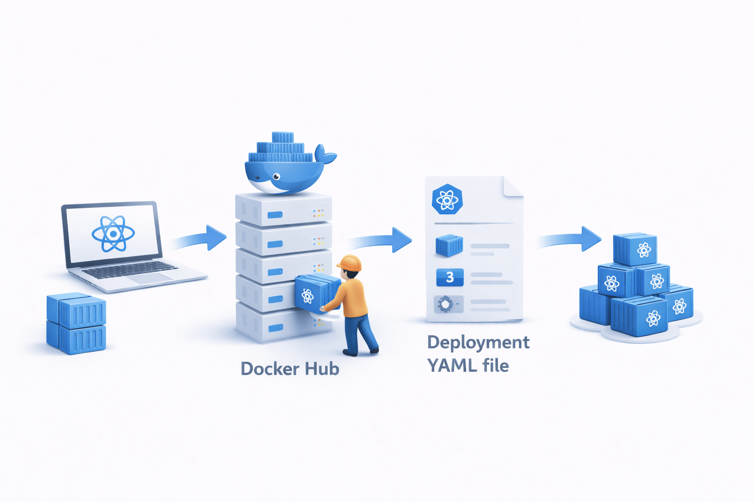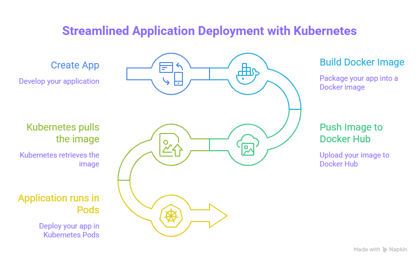 Create Application → Package with Docker → Upload to Docker Hub → Deploy on Kubernetes