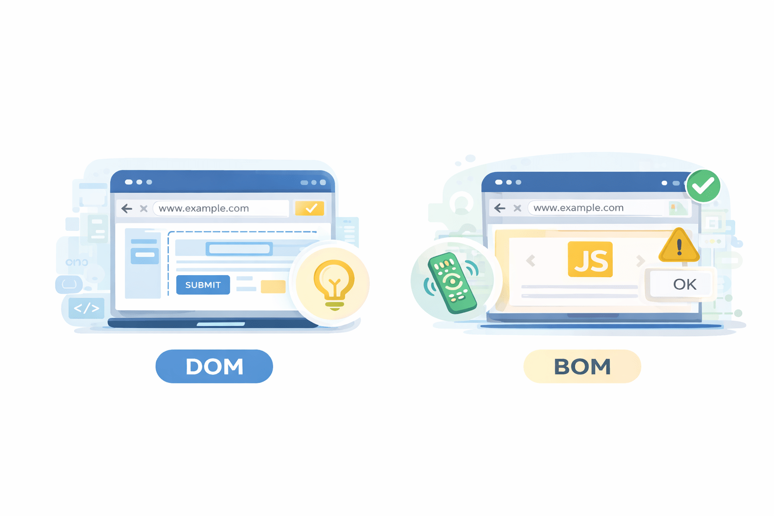 DOM manipulates page content, while BOM controls the browser itself