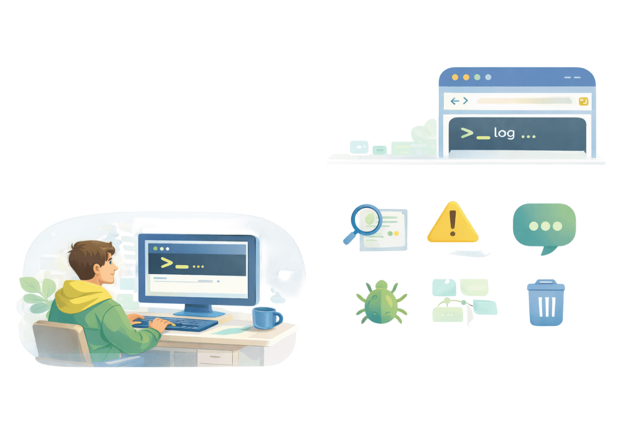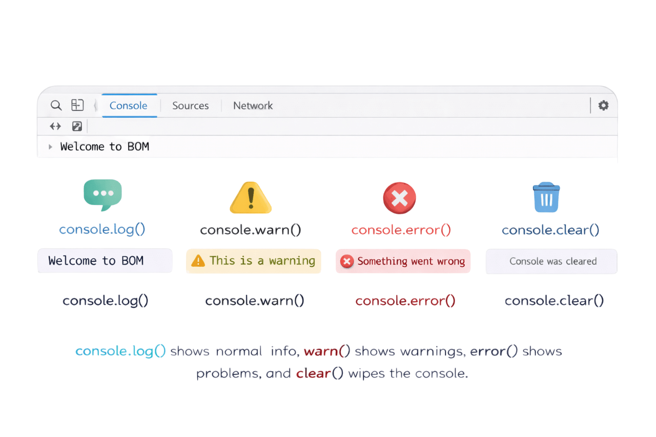 console.method() shows messages in the browser's console, helping developers debug and understand code.