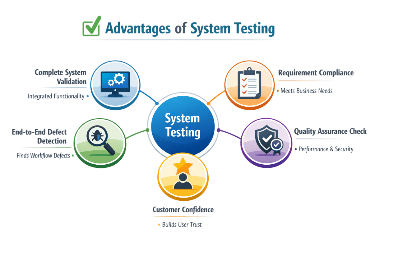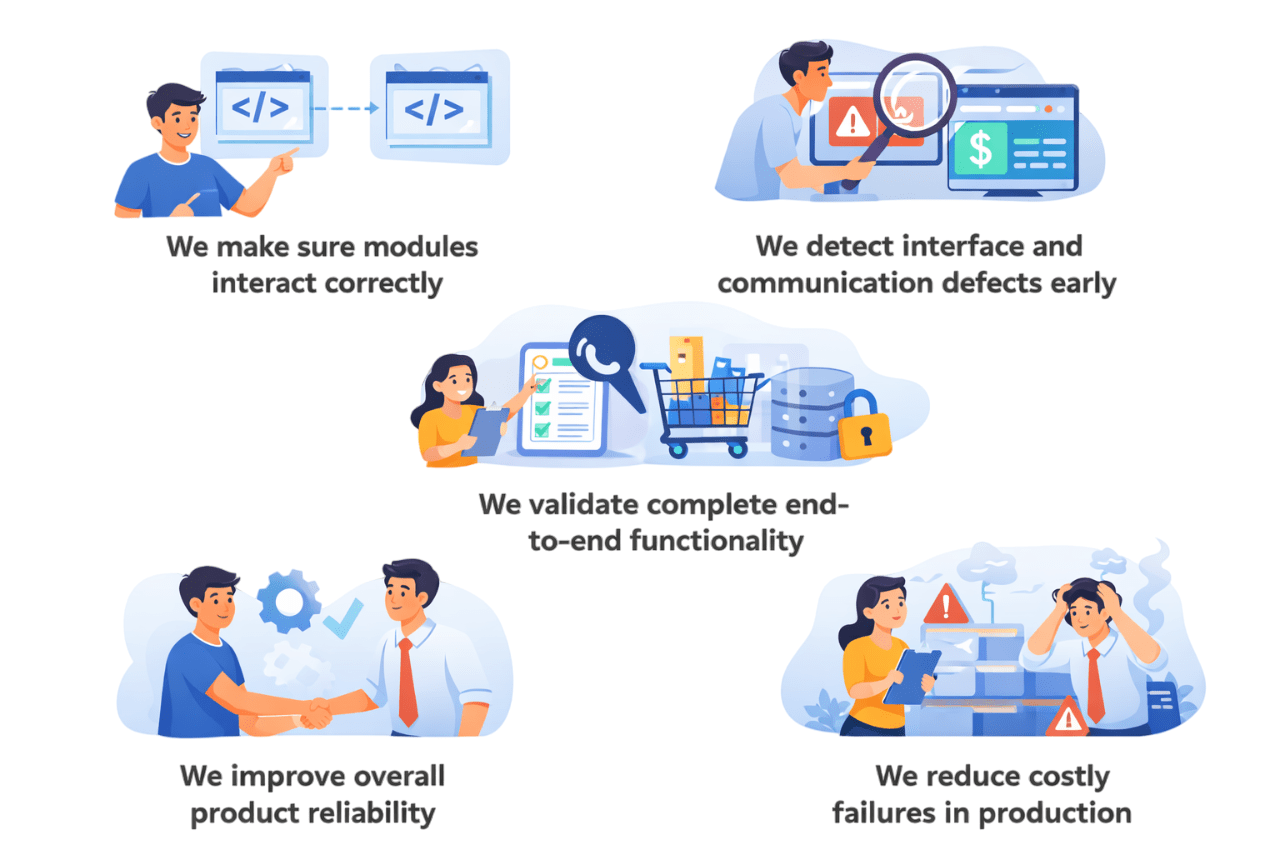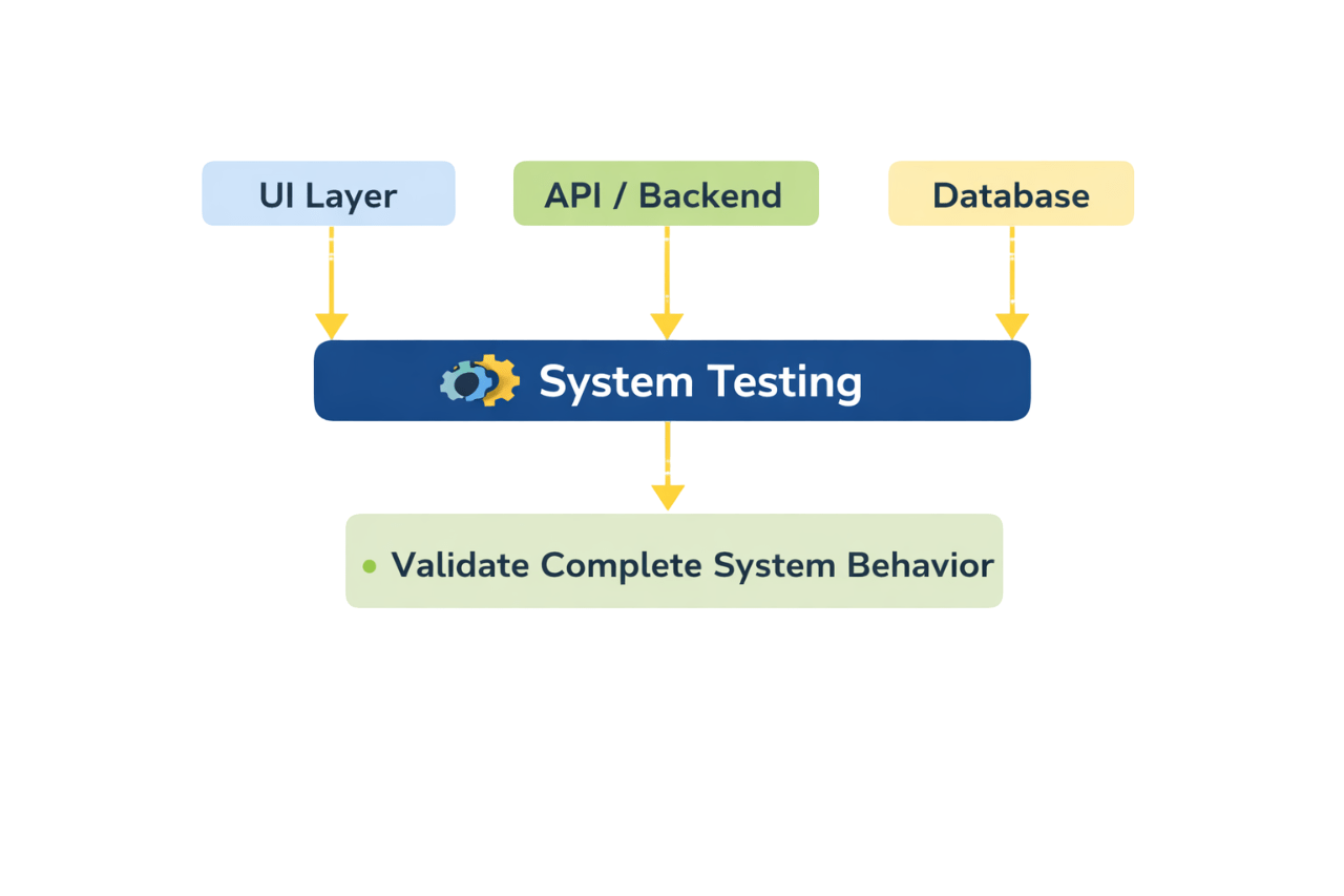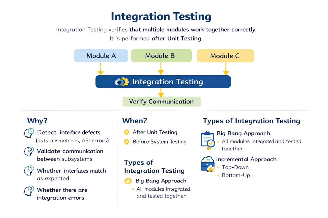 | Focus Area | Interaction between modules & interfaces | Complete system functionality & requirements |