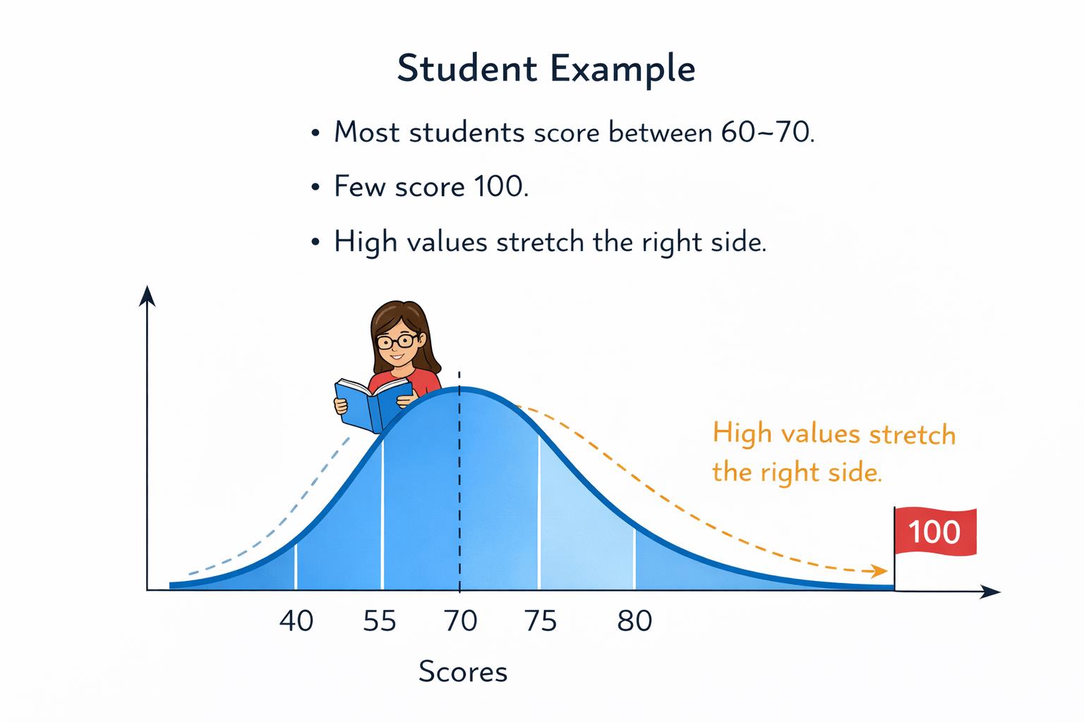 📍 Many students scored around 70–80 → values are clustered in the middle