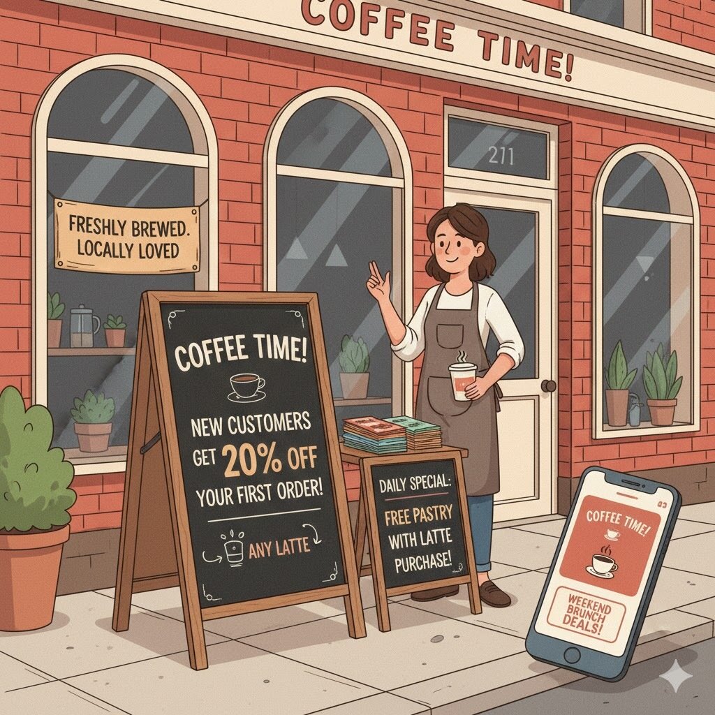 A coffee shop wants more customers. The owner puts up boards to create awareness, shares special offers, and runs small ads.