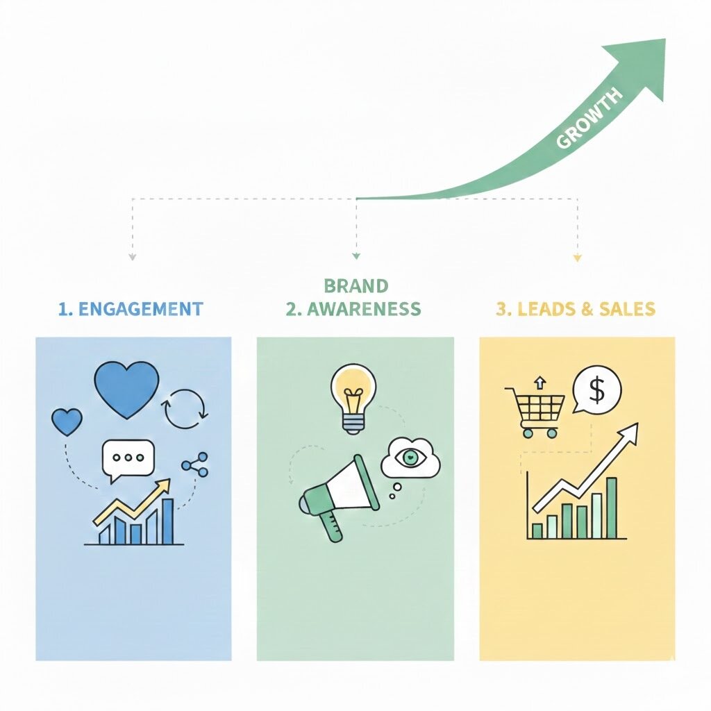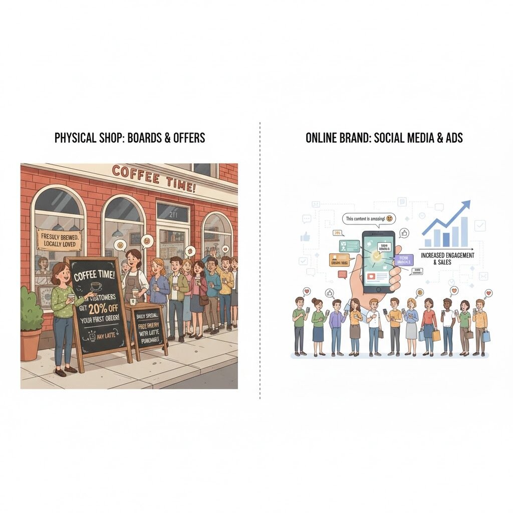 Just like a shop uses boards and offers to get customers, brands use social media posts and ads to attract people, engage them, and turn them into loyal followers.