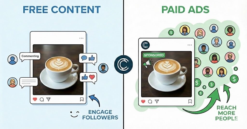 Organic reaches followers for free, while paid ads increase visibility.