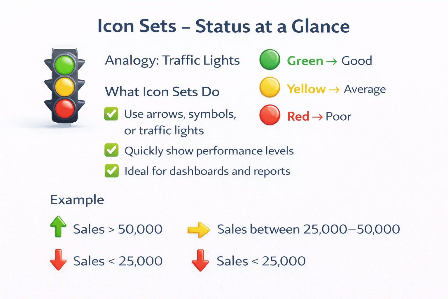 Use arrows, symbols, or traffic lights