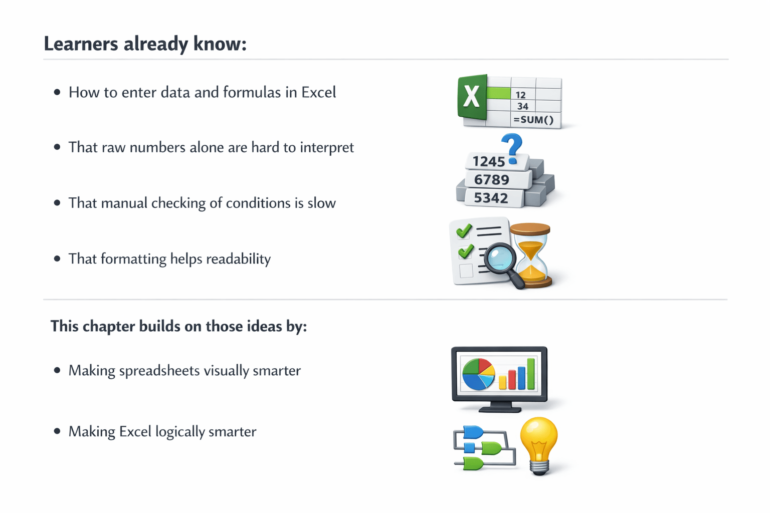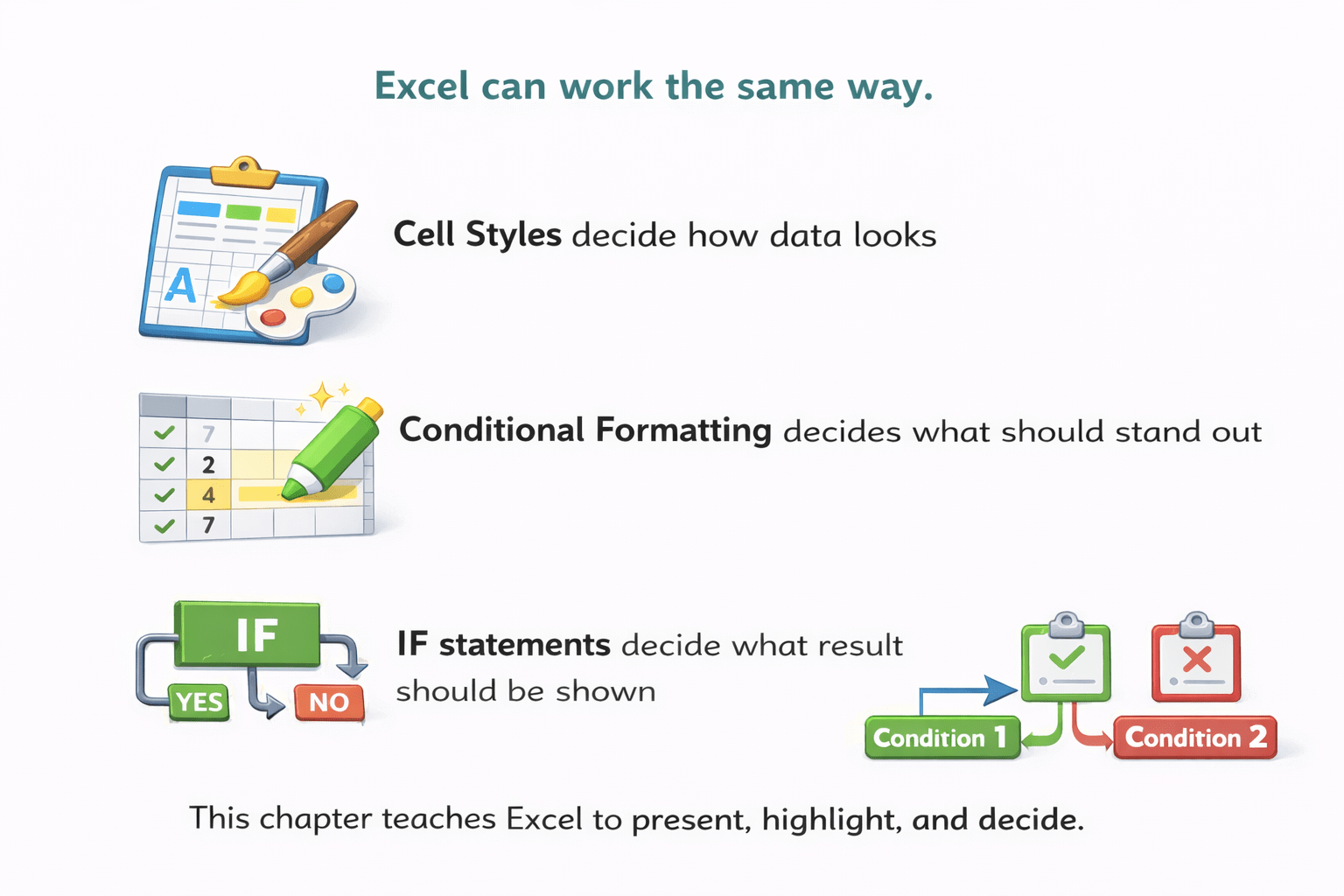 This chapter teaches Excel to present, highlight, and decide.