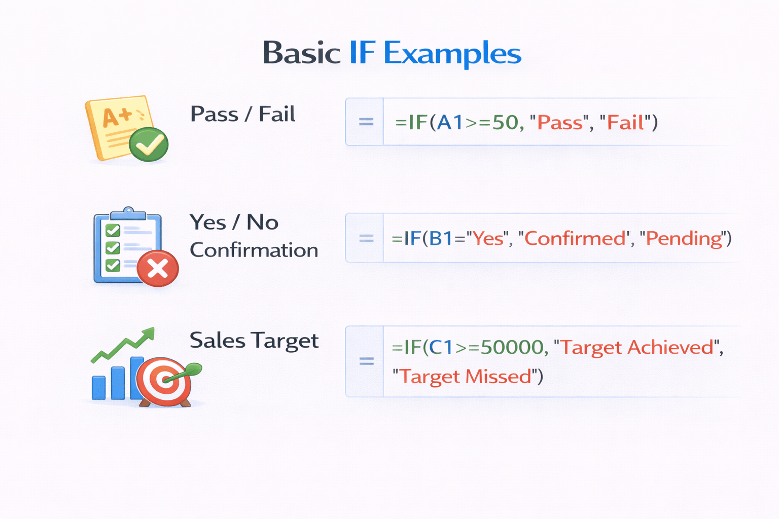 IF(A1>=50, "Pass", "Fail")