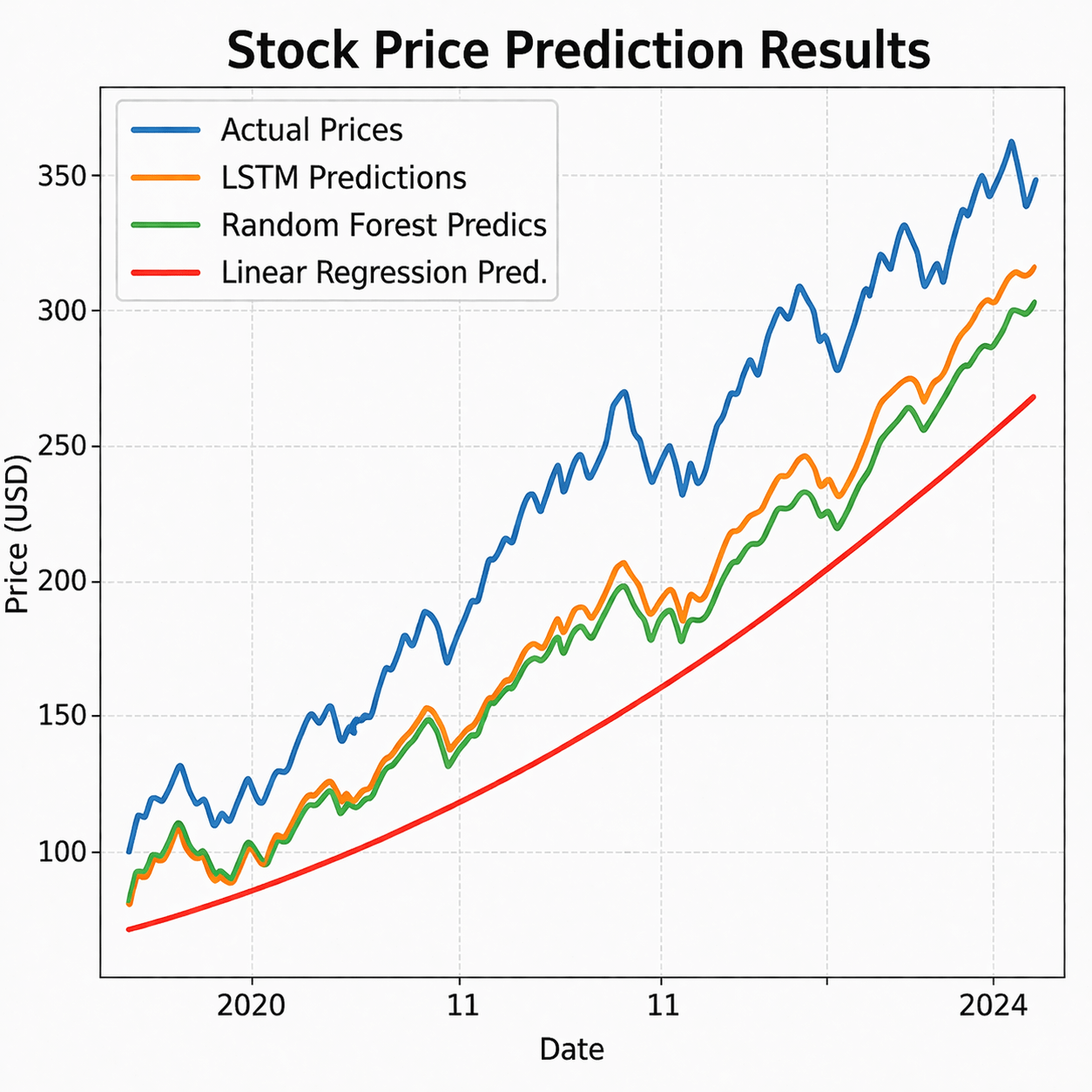 # 0.81 ➔ $162.50Overlaying our predictions on real-world stock prices reveals how closely the LSTM learned the underlying trend.