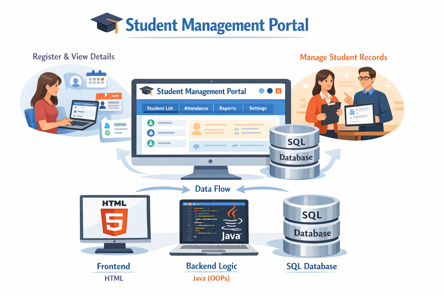 You are part of a software development team building a Student Management Portal for a school.The system should allow students to register and view their details, while admin/teachers can store, update, and retrieve student records.