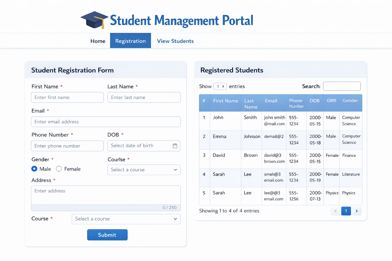 3. Create a Student Details Page (HTML Table) to display registered student information
