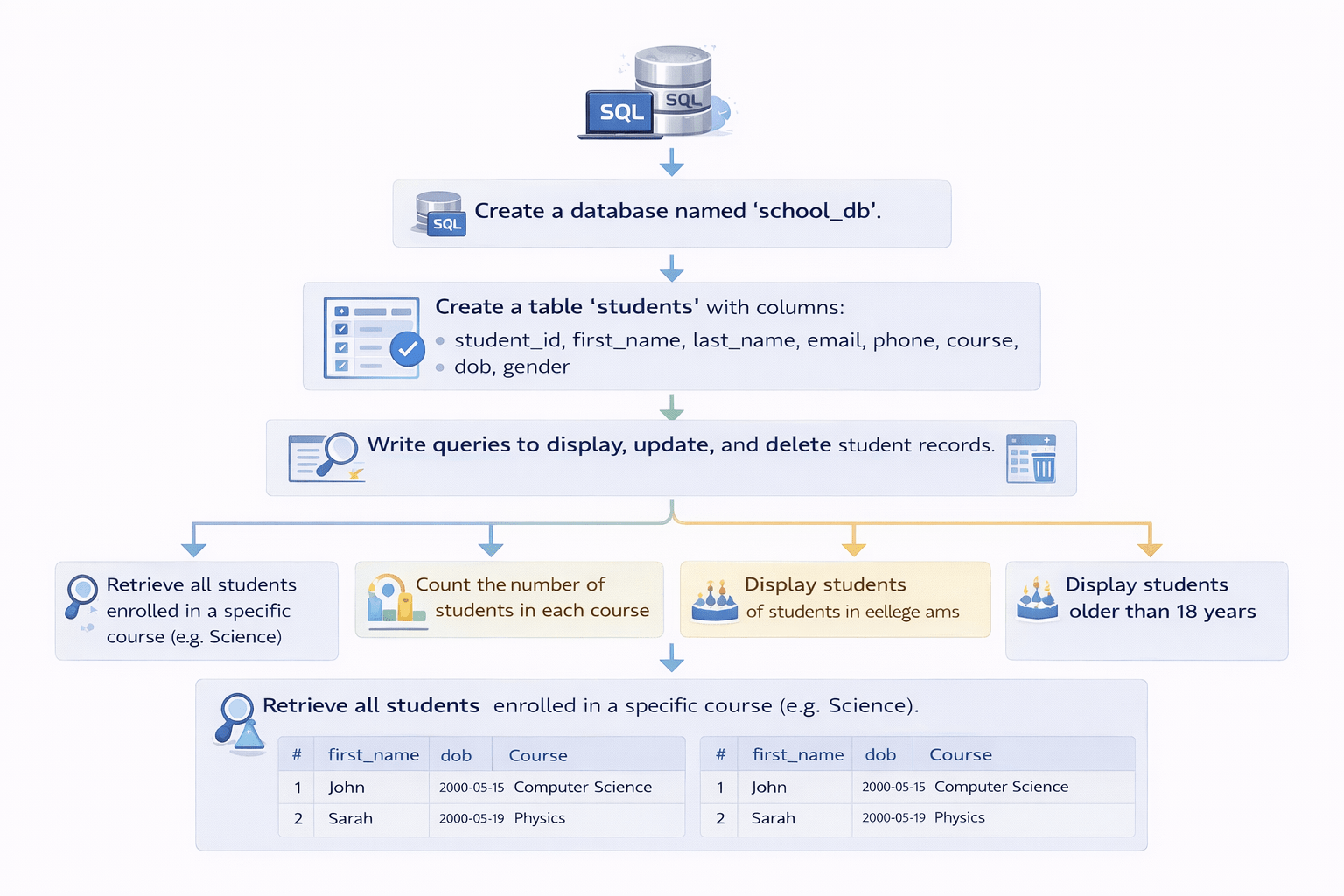 Write queries to display, update, and delete student records