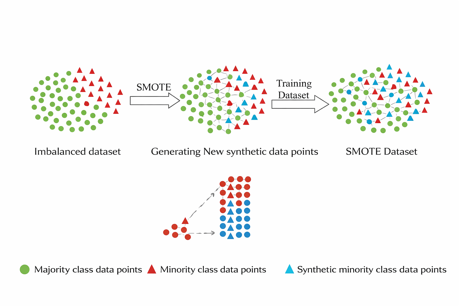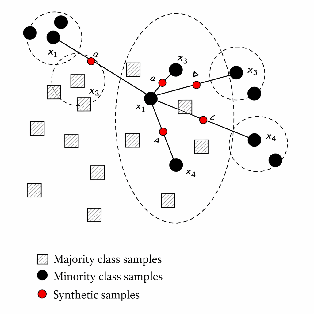 The algorithm blends features of nearby minority points to create realistic new data.