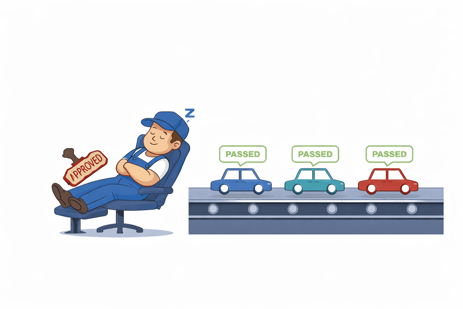 He just blindly stamps "PASSED" on all 100 cars.