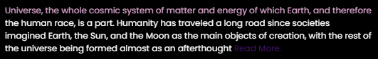 <p>Universe, the whole cosmic system of matter and energy of which Earth, and therefore the human