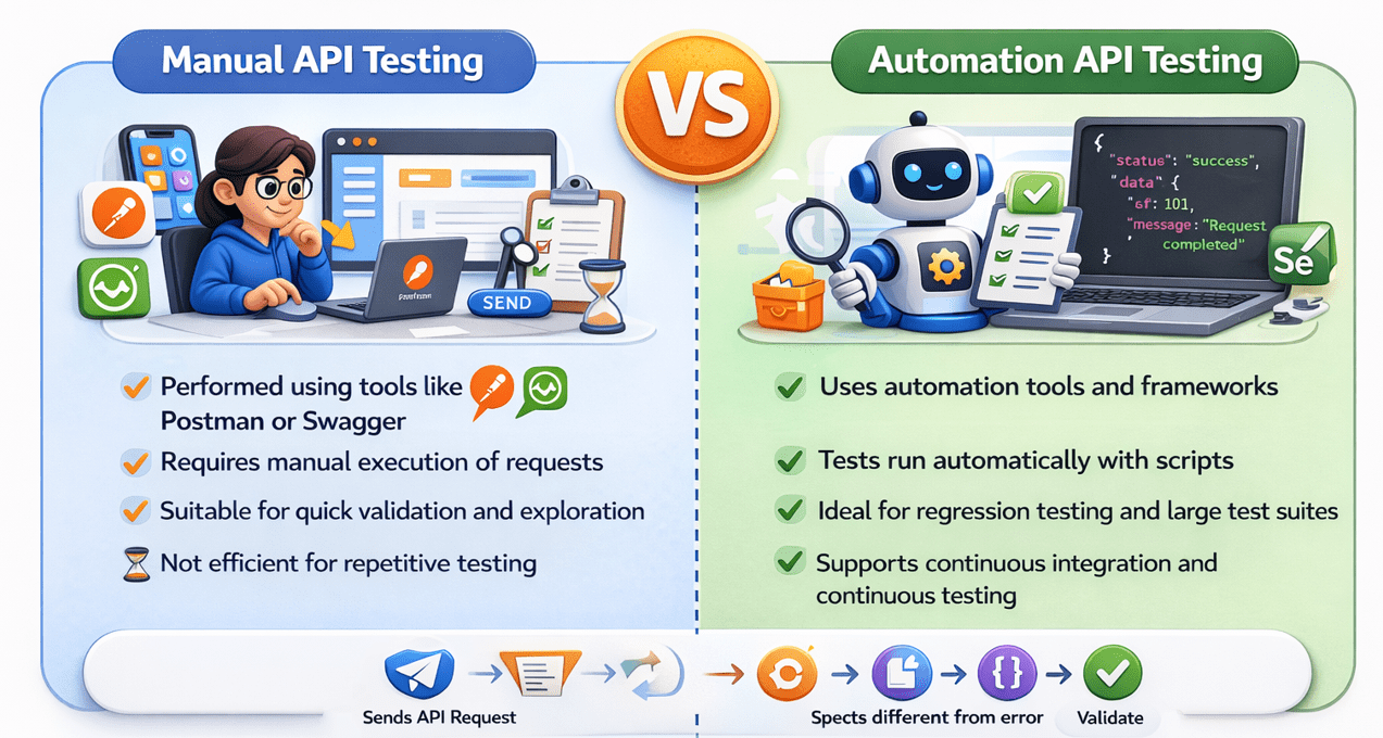 While tools like Postman or Swagger help us manually send requests and validate responses, manual testing can become time-consuming and repetitive when the number of APIs and test scenarios increases.