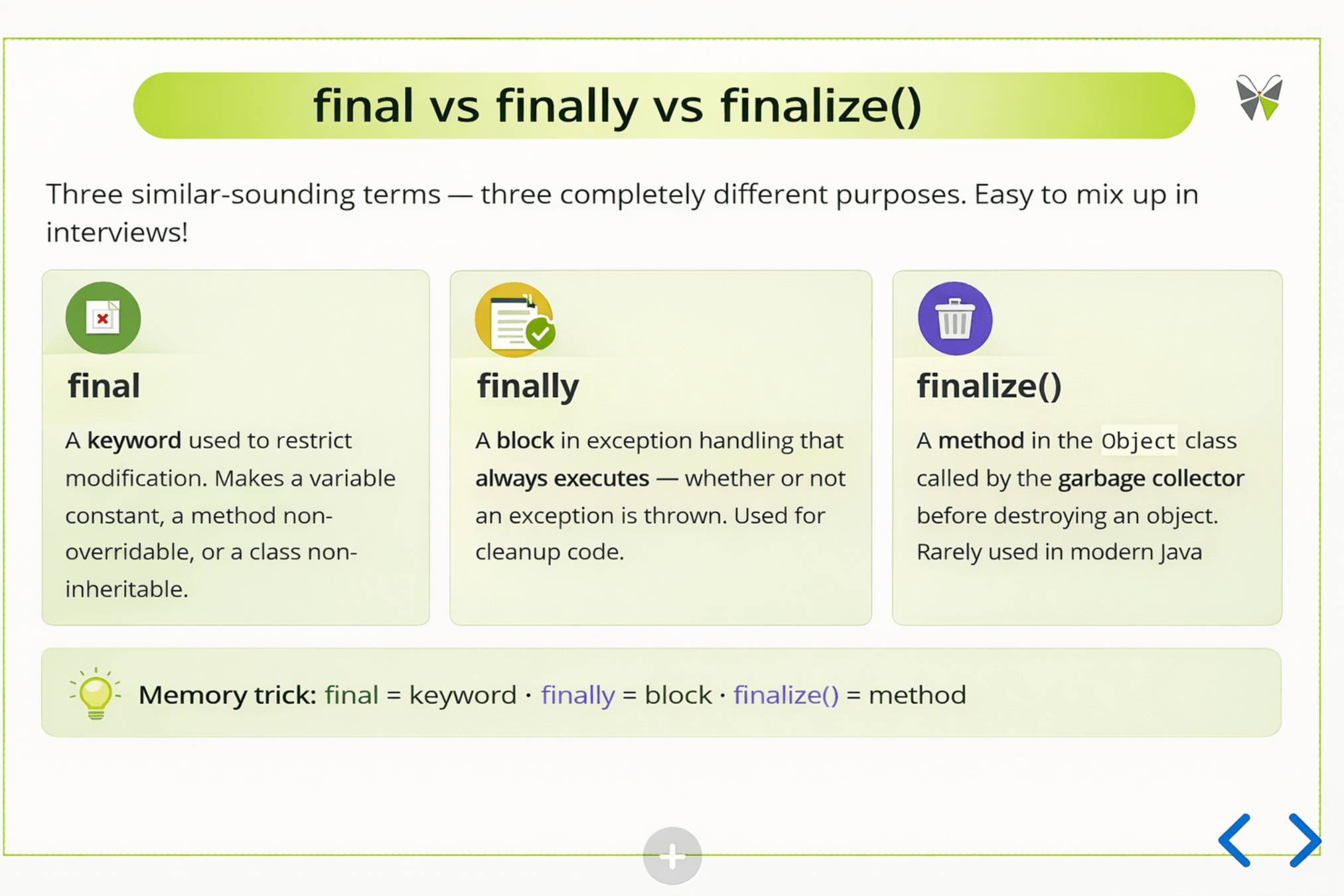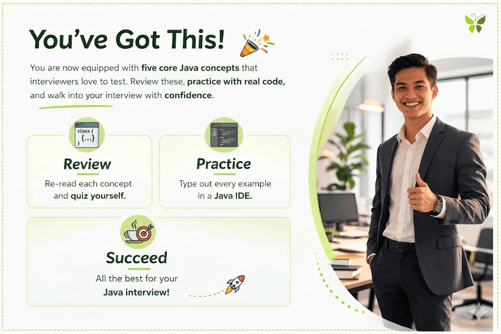 You're now equipped with five core Java concepts that interviewers love to test. Review these, practice with real code, and walk into your interview with confidence.