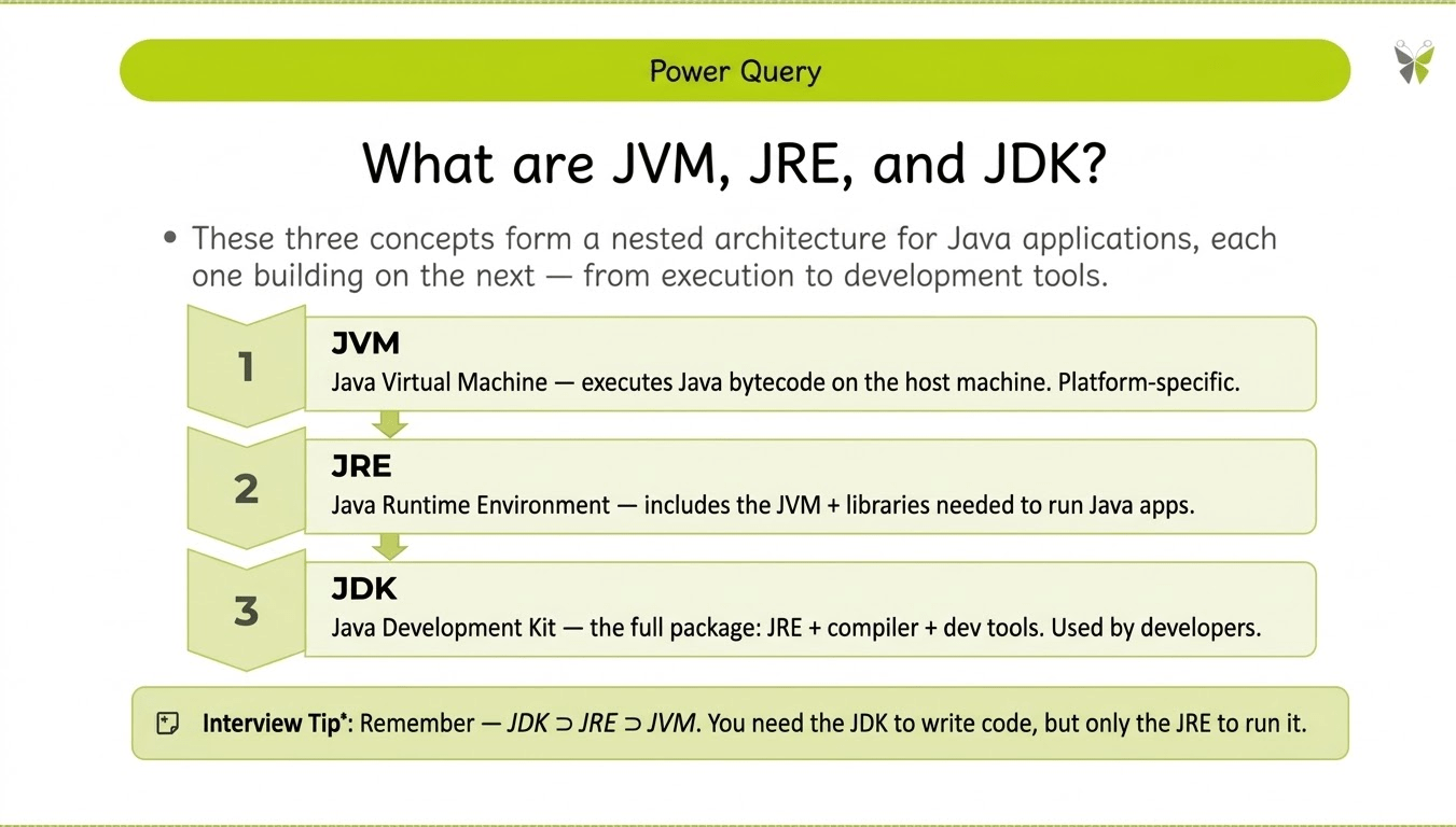 💡 Interview Tip:- Remember — JDK ⊃ JRE ⊃ JVM. You need the JDK to write code, but only the JRE to run it.