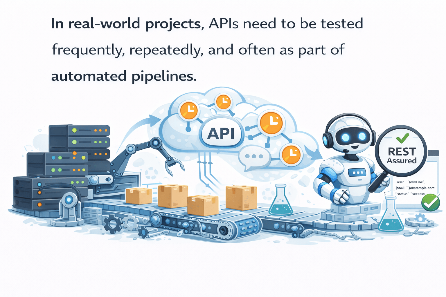 In real-world projects, APIs need to be tested frequently, repeatedly, and often as part of automated pipelines.