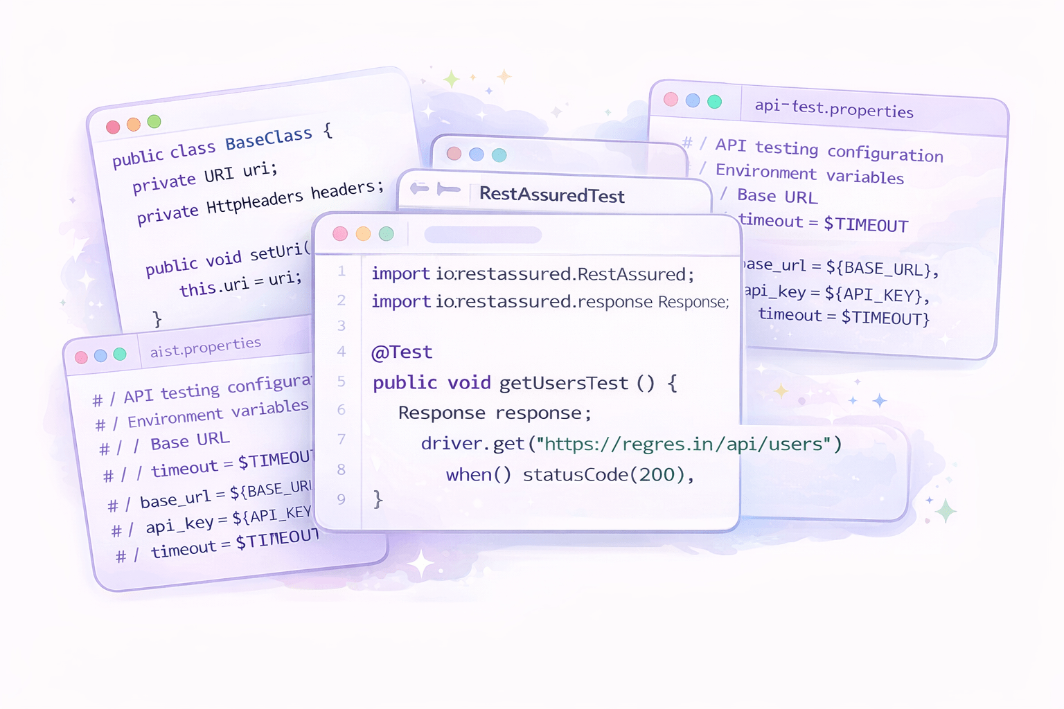 - ConfigReader.javaContains actual test classes with API verifications.