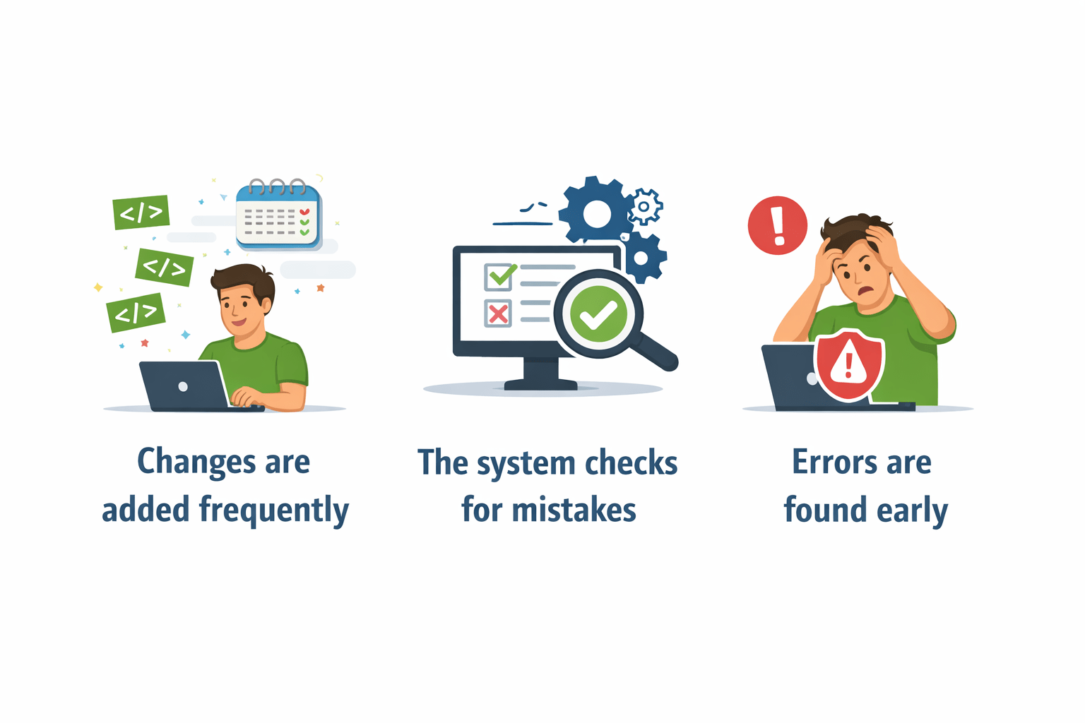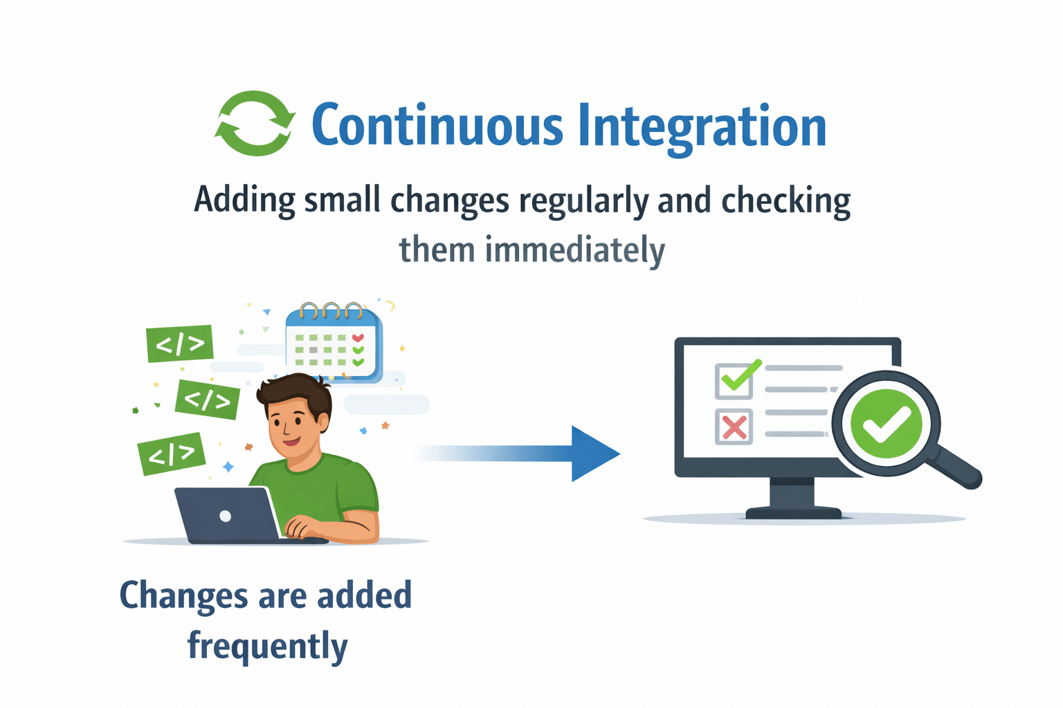 Continuous Integration means adding small changes regularly and checking them immediately.