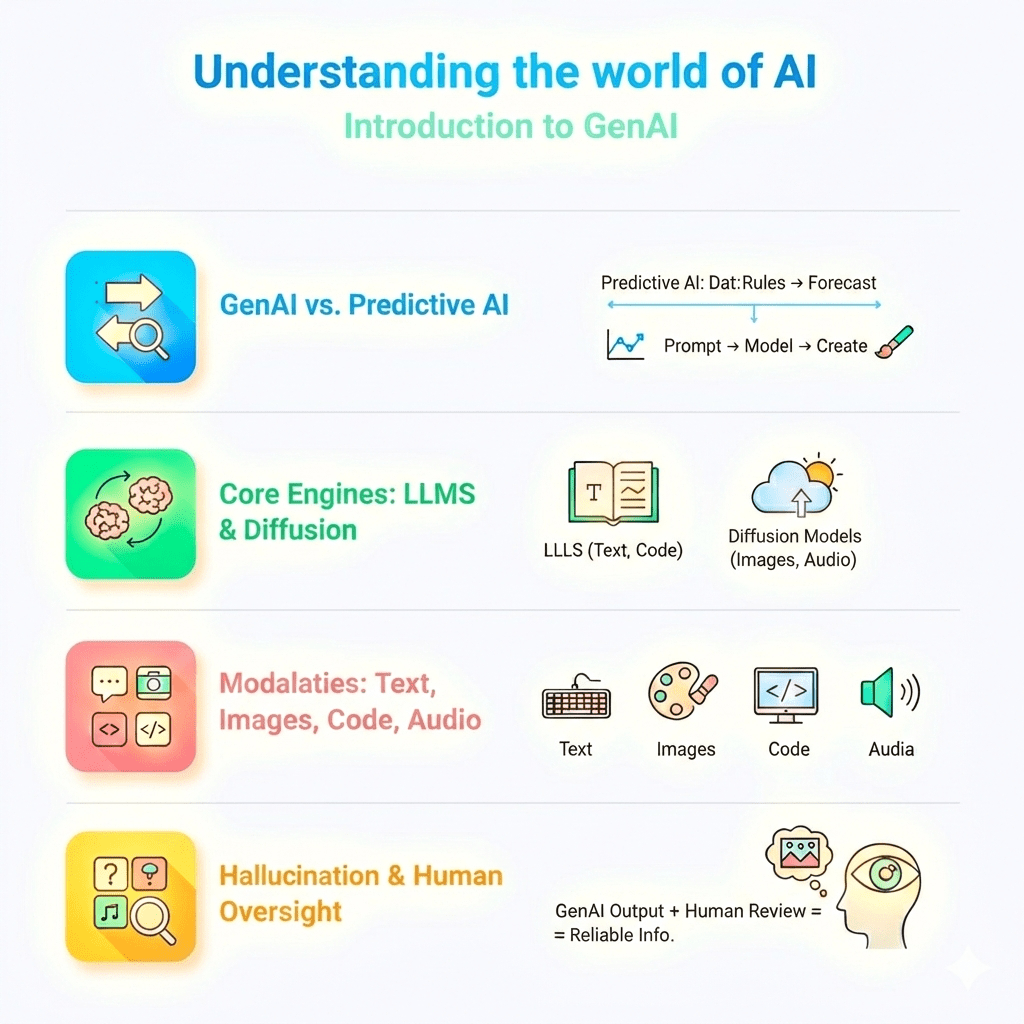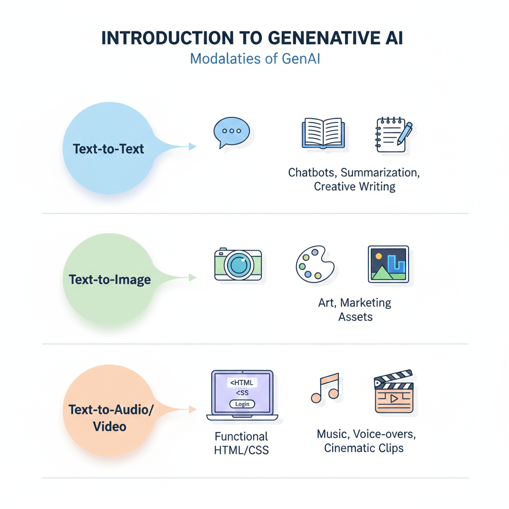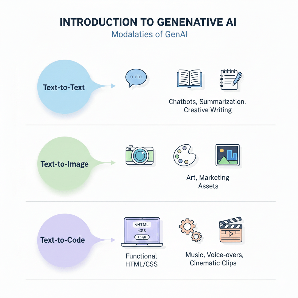 Explore "Modalities": How GenAI creates text,images,code,and audio.